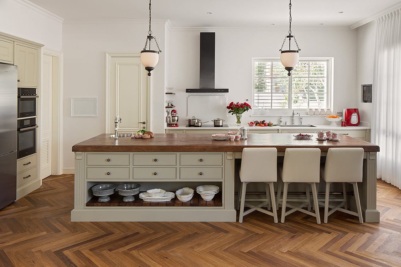 A modern country kitchen with clean lines and light colors that correspond with the great amount of light that comes in from the outside space (thanks to the windows that surround it in all directions). Along with the prestige and quality that stand out so prominently due to its careful design, this is first and foremost an intimate, family country style kitchen. The island at the center combines many storage spaces and serves as a dining area and sitting area for social gatherings.